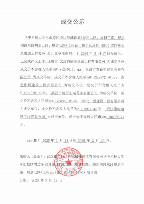 華中科技大學軍山校區(qū)周邊基礎設施(規(guī)劃二路、規(guī)劃三路、規(guī)劃四路東段規(guī)劃五路、規(guī)劃七路)工程設計施工總承包(EPC)道路排水及附屬工程勞務成交公示